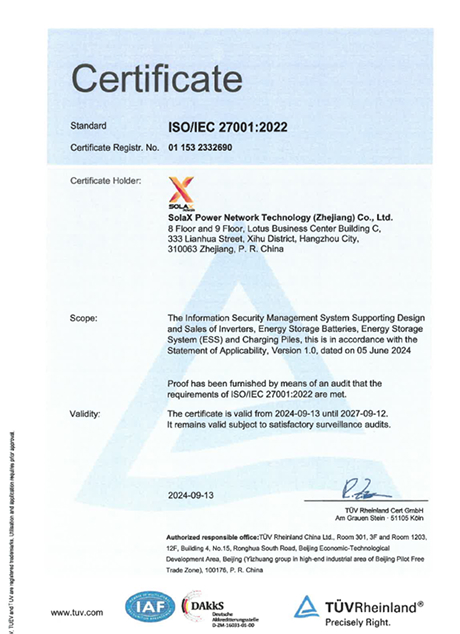 SolaX mantiene los más altos estándares en gestión de calidad, seguridad y fiabilidad a través de certificaciones reconocidas internacionalmente. Nuestros rigurosos sistemas de control de calidad garantizan que todos los productos cumplan con las estrictas normativas del sector y las expectativas de los clientes. Con su compromiso con la excelencia, SolaX ofrece soluciones de energía solar fiables y de alto rendimiento para un futuro sostenible.